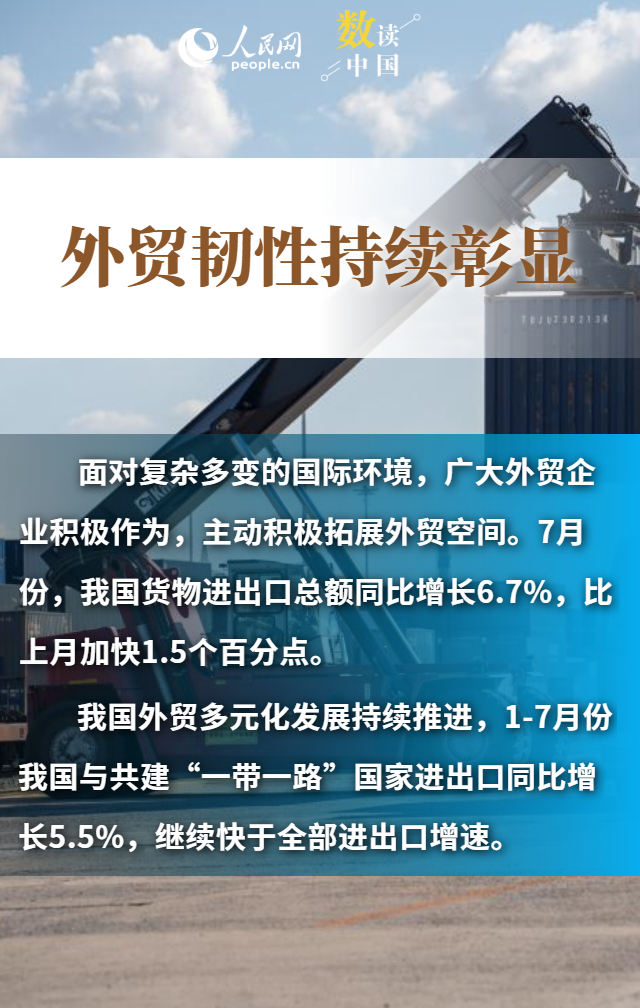 進(jìn)出口規(guī)模創(chuàng)歷史新高、“朋友圈”不斷擴(kuò)大、民營企業(yè)持續(xù)創(chuàng)新……數(shù)據(jù)顯示,今年前7個(gè)月,我國貨物貿(mào)易進(jìn)出口總值25.7萬億元,同比增長3.5%。在外部挑戰(zhàn)之下,我國貨物進(jìn)出口持續(xù)增長,展現(xiàn)出較強(qiáng)韌性和活力,為世界經(jīng)濟(jì)復(fù)蘇注入了中國力量。