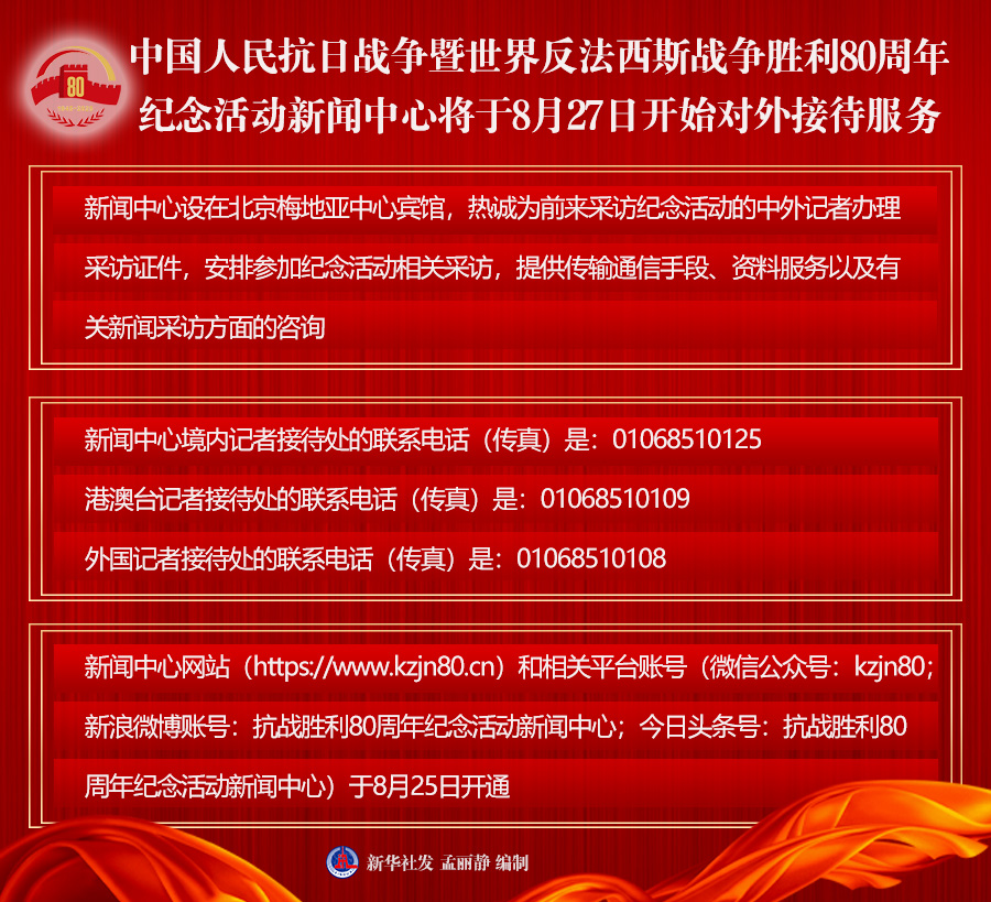 新聞中心網(wǎng)站(https://www.kzjn80.cn)和相關(guān)平臺賬號(微信公眾號:kzjn80;新浪微博賬號:抗戰(zhàn)勝利80周年紀念活動新聞中心;今日頭條號:抗戰(zhàn)勝利80周年紀念活動新聞中心)將于8月25日開通。