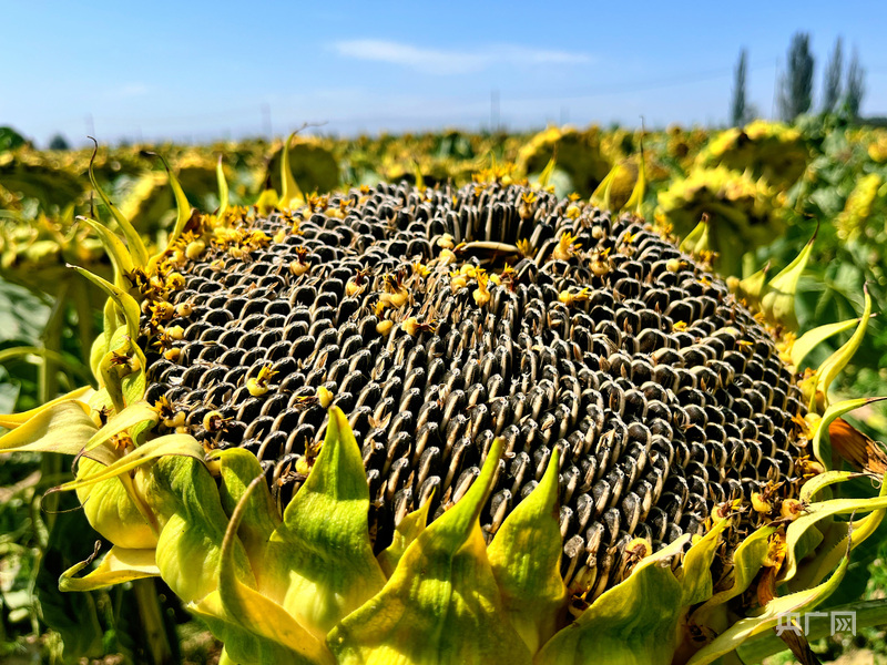 在這片萬畝連片種植區(qū),種植戶王多寶正帶領(lǐng)工人切割葵盤、插桿晾曬?!敖衲晏鞖夂?,葵花長勢特別旺,籽粒又大又亮,產(chǎn)量肯定差不了?!北M管汗水浸濕衣衫,喜悅卻洋溢在他的臉龐。