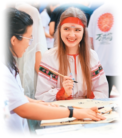 8月6日,“上合之約·絲路津彩”上合國家青年學(xué)生“萬花筒”文化市集在天津舉行。圖為青年學(xué)生體驗書法。