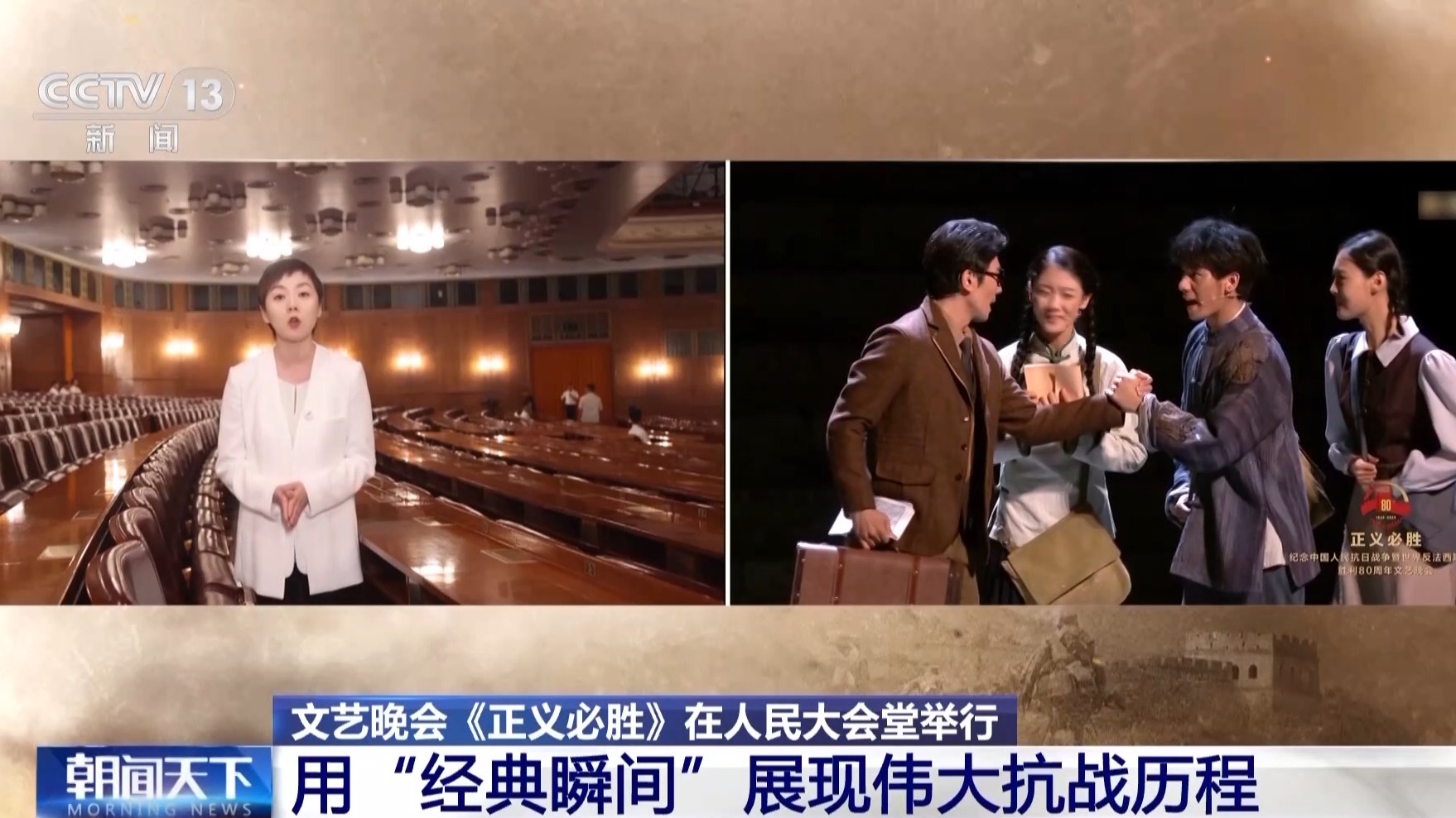 總臺央視記者 曹巖:從八月起我們一直在現(xiàn)場跟蹤記錄抗戰(zhàn)勝利80周年紀(jì)念晚會的排練,我個人覺得這場晚會最大的特征,就是在里面我們看到的不是一個又一個的獨(dú)立節(jié)目,而是一整部的情景史詩劇。