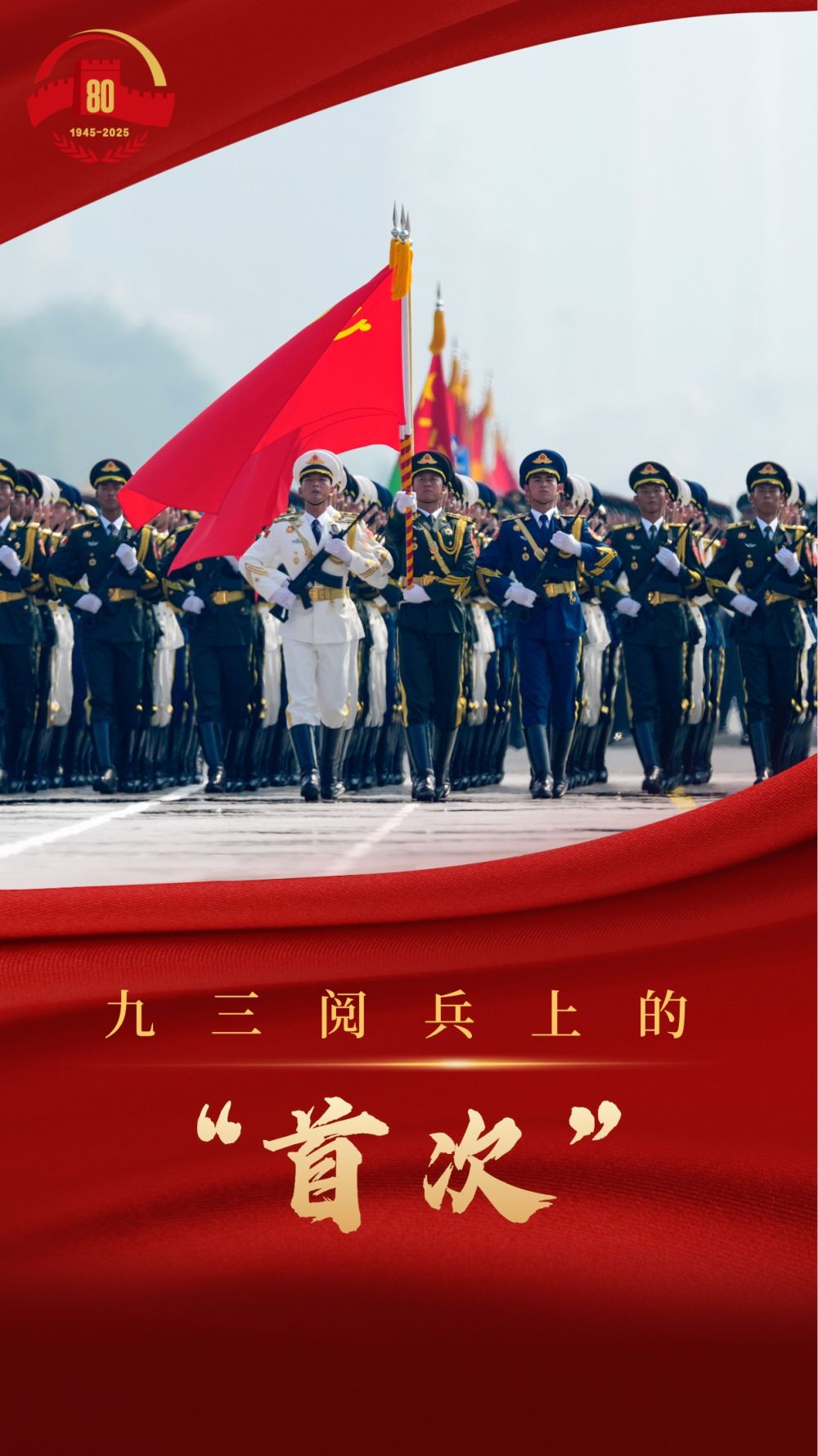在編排上,設(shè)置14個排面寓意中國人民14年抗戰(zhàn)歷程,設(shè)置80名禮號手以紀念抗戰(zhàn)勝利80周年。