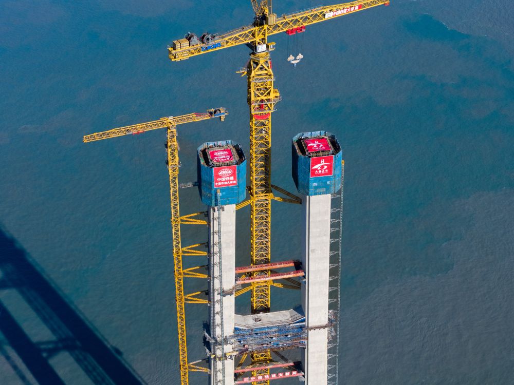 圖為雙嶼門特大橋首個主塔封頂施工現(xiàn)場。(中國鐵建大橋局供圖)
