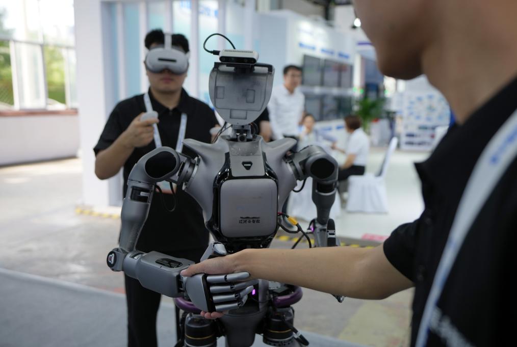 9月6日,在2025全球工業(yè)互聯(lián)網(wǎng)大會(huì)展覽區(qū),工作人員演示具身智能操作系統(tǒng)。新華社記者 李鋼 攝