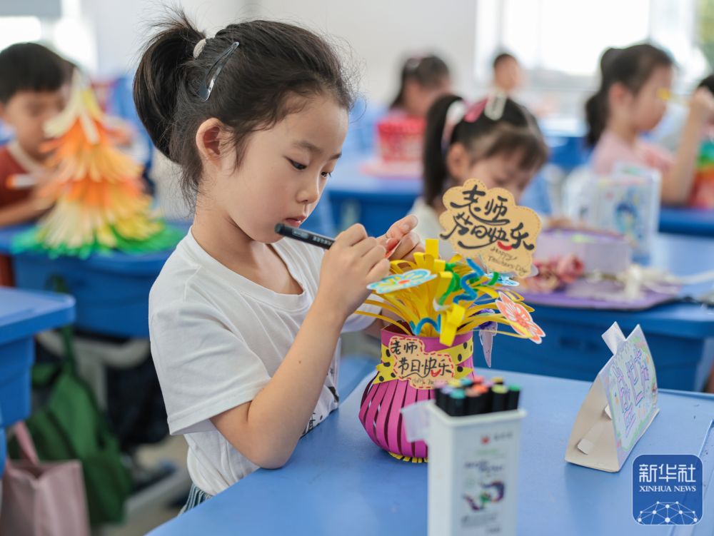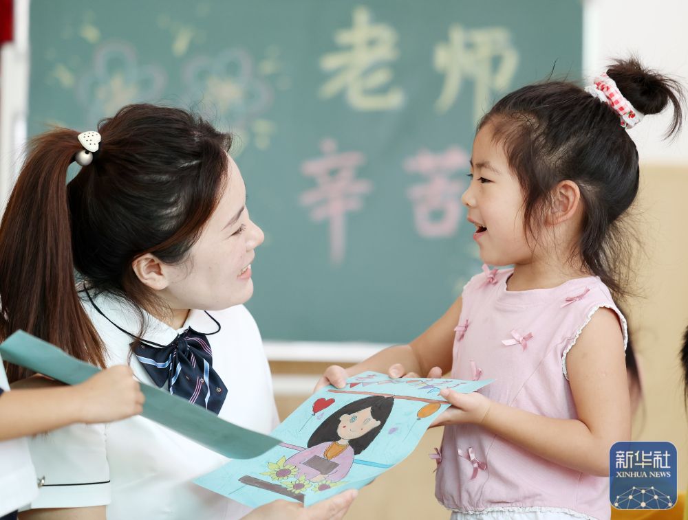 9月9日,山東省臨沂市郯城縣郯城街道官塘幼兒園的孩子將在老師的指導幫助下制作的繪畫送給老師。新華社發(fā)(張春雷攝)