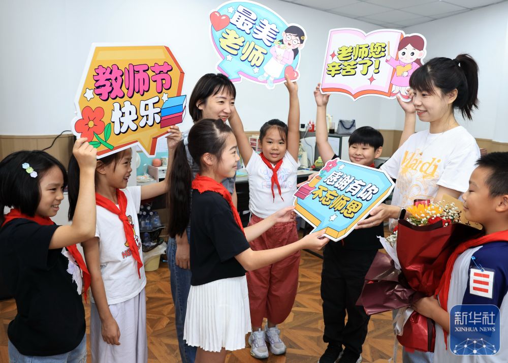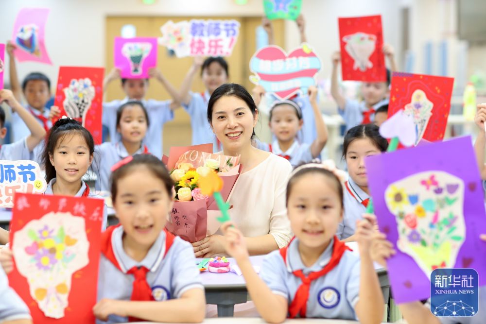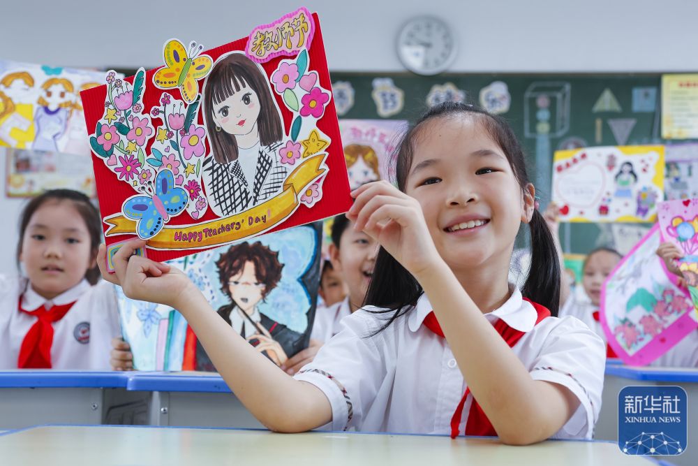 9月9日,在武漢市未來實驗小學美林校區(qū),學生為教師送上節(jié)日祝福。新華社發(fā)(趙軍攝)