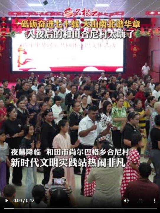 夜幕降臨后,和田市肖爾巴格鄉(xiāng)合尼村新時代文明實踐站熱鬧非凡。村民們自發(fā)編排舞蹈,有的放聲歌唱、有的盡情起舞,紛紛在舞臺上亮出本領(lǐng)、一展風(fēng)采。精彩的文體活動,為村民送上 “家門口的文化大餐”,既帶來歡聲笑語,也獻上視覺盛宴,更讓大家的生活滿是幸福滋味。