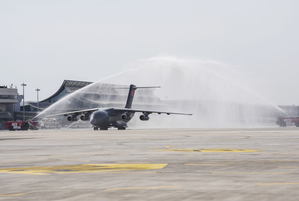9月12日,第十二批在韓中國人民志愿軍烈士遺骸回國。這是在沈陽桃仙國際機(jī)場,接運(yùn)烈士遺骸回國的運(yùn)-20專機(jī)通過水門。新華社記者 潘昱龍 攝