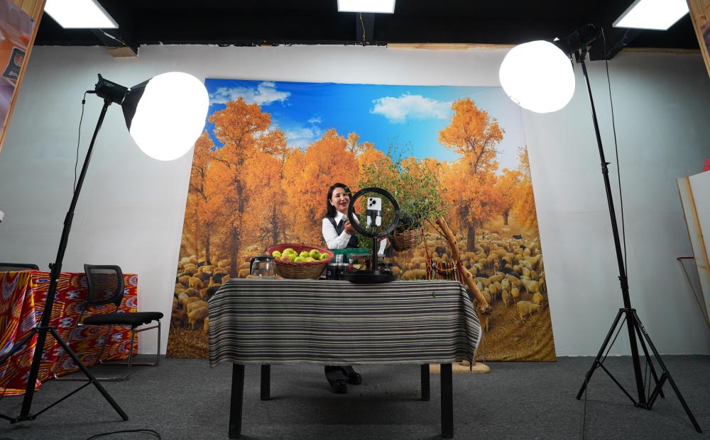 9月19日,尉犁縣電商協(xié)會負(fù)責(zé)人米日阿依·阿西木在達(dá)西村的電商基地直播推介達(dá)西村農(nóng)產(chǎn)品。近年來,達(dá)西村構(gòu)建“農(nóng)戶生產(chǎn)+企業(yè)加工包裝+電商銷售+物流配送”全產(chǎn)業(yè)鏈,為縣域經(jīng)濟(jì)發(fā)展培養(yǎng)孵化本土直播電商人才,促進(jìn)傳統(tǒng)產(chǎn)業(yè)轉(zhuǎn)型升級。