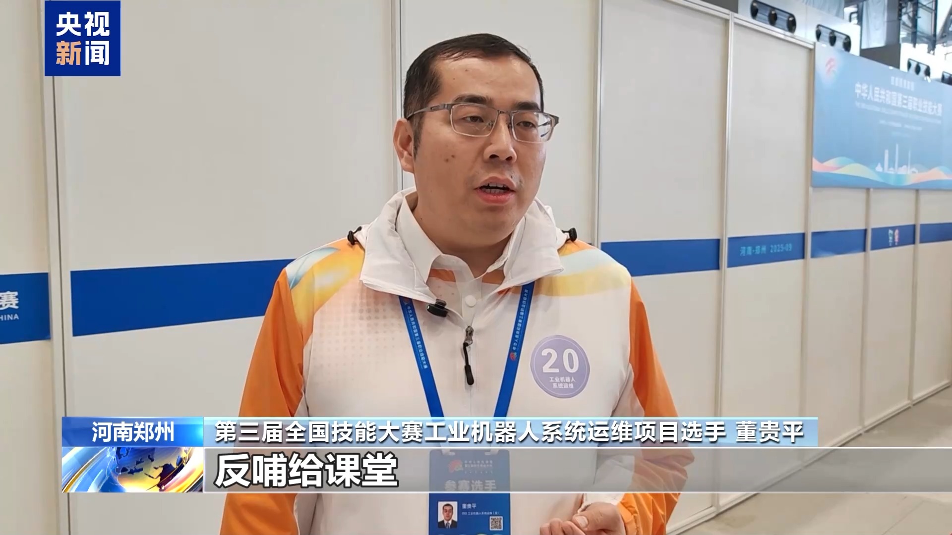 第三屆全國(guó)技能大賽工業(yè)機(jī)器人系統(tǒng)運(yùn)維項(xiàng)目選手 董貴平:能夠把學(xué)到的一些實(shí)操技能以及理論知識(shí),反哺給課堂,提升學(xué)生的理論儲(chǔ)備以及實(shí)操的技能。