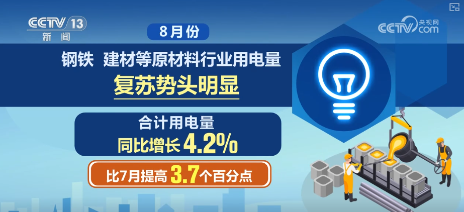 除了制造業(yè),8月份,鋼鐵、建材等原材料行業(yè)用電量復(fù)蘇勢頭明顯,合計(jì)用電量同比增長4.2%,比7月提高3.7個(gè)百分點(diǎn)。