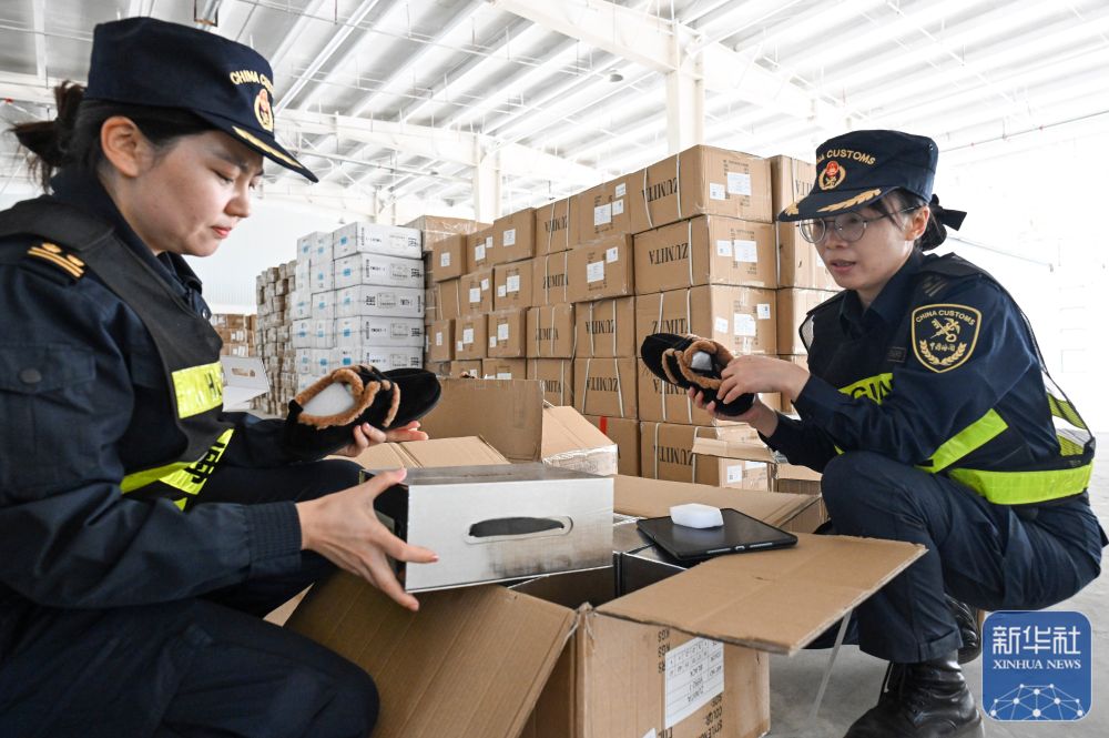 ↑9月17日,新疆塔城海關工作人員在巴克圖口岸集中查驗區(qū)檢查一批經由該口岸運往哈薩克斯坦的鞋品。