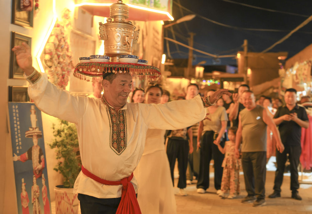 夜幕降臨,煙火氣息在庫(kù)車(chē)?yán)铣菑浡?。廣場(chǎng)上傳來(lái)歡快的樂(lè)曲聲,舞者頭頂銅盤(pán)銅壺,腳步輕快,將迎賓之禮——薩瑪瓦爾舞展現(xiàn)在游客面前,掌聲與歡笑聲此起彼伏。