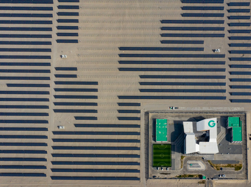 9月22日在新疆巴音郭楞蒙古自治州若羌縣拍攝的中國綠發(fā)新疆中綠電若羌400萬千瓦光伏項目(無人機照片)。該項目每年可發(fā)電69.08億千瓦時,滿足南疆200萬戶家庭用電需求,減排208.24萬噸煤耗。