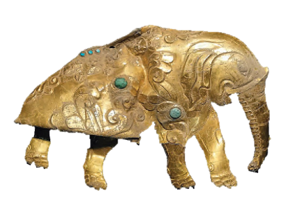 血渭一號(hào)墓出土的鑲綠松石金象飾片(中國社科院考古所供圖)