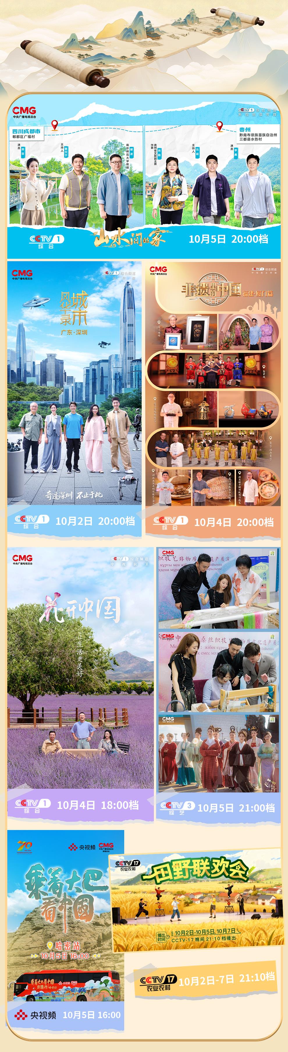八天假期,想好去哪兒玩了嗎?來,跟著總臺去打卡!頭兩站:四川、貴州!《山水間的家(第四季)》“山水小分隊”邀你在川西林盤探韭香產(chǎn)業(yè),在黔南山鄉(xiāng)看巖椒成林。第三站:廣東。《城市風(fēng)華錄》帶你去深圳探訪全球首家機(jī)器人6S店,感受“奇跡之城”向新向好的澎湃動力。第四站:福建。珠繡、漆線雕、閩南童謠、高甲戲……看《非遺里的中國》,領(lǐng)略廈門非遺之美。第五站:新疆。從《花開中國》開啟一場跨越天山的芬芳之旅,在《衣錦天下 絲路季》發(fā)現(xiàn)絲綢之路上的中國審美,《乘著大巴游中國》探尋哈密甜美密碼。第六站:內(nèi)蒙古。在通遼參加《田野聯(lián)歡會》,體驗(yàn)鄉(xiāng)土文化新活力。這八天的旅程,你不會錯過雄奇的風(fēng)光、古老的文化、新奇的創(chuàng)造,還有熱氣騰騰的生活。