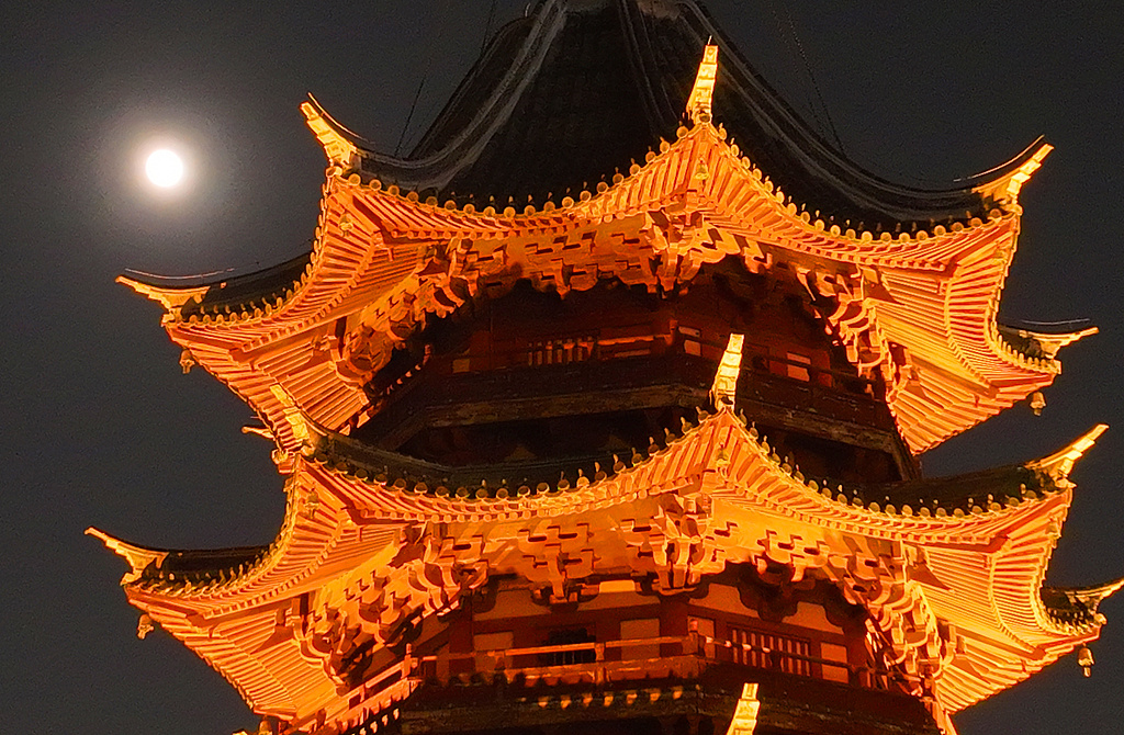 一輪圓月從浙江省臺州市仙居縣安洲塔上空升起。