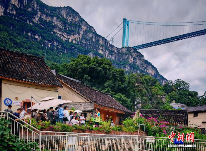 在花江村,記者看到不少游客悠閑地坐在青瓦灰墻的布依族傳統(tǒng)民居前品茶觀橋,或在村口的路邊尋找最佳角度,留下“與大橋同框”的紀(jì)念照;更有游客信步走向村邊的花江鐵索橋,尋找角度拍攝這座曾是黔滇往來(lái)要道的古橋,與遠(yuǎn)處現(xiàn)代工程的杰作形成“新老同框”的獨(dú)特畫(huà)面。