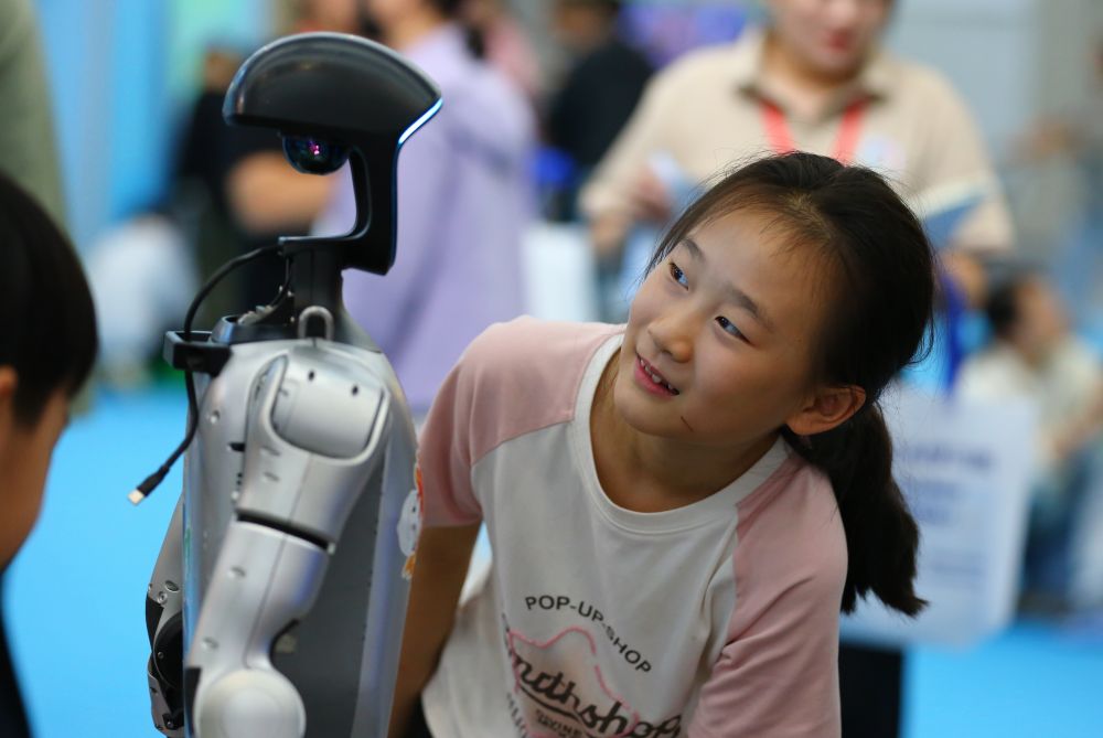 10月2日,在山東省第九屆滕州書展現(xiàn)場,小朋友與機器人互動。新華社發(fā)(李志軍攝)