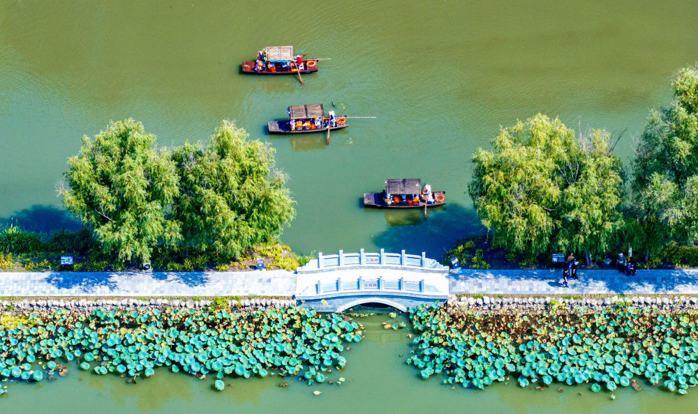 10月7日,游客在江蘇興化里下河國家濕地公園乘船游玩(無人機照片)。新華社發(fā)(周社根攝)
