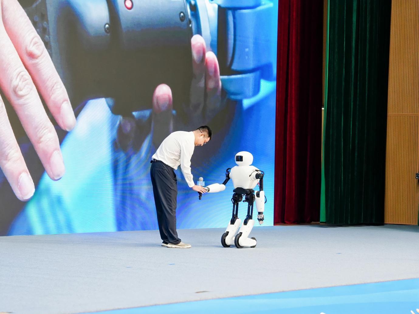 “荊楚”人形機器人遞上話筒。