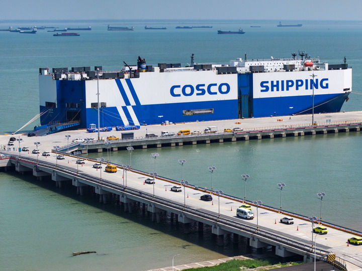 江蘇太倉港,“禮諾運輸”號貨輪載著2600余輛汽車奔赴歐洲,“玉衡先鋒”號貨輪正將3600多輛國產(chǎn)新車運往東南亞。