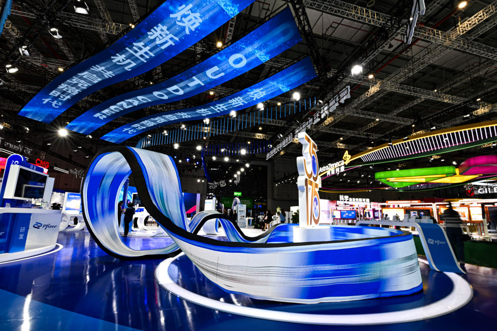 這是2024年11月8日在第七屆進(jìn)博會醫(yī)療器械及醫(yī)藥保健展區(qū)拍攝的輝瑞展臺。新華社記者 辛悅衛(wèi) 攝