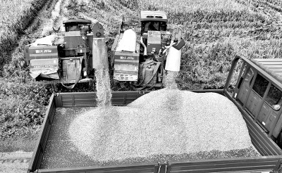 農(nóng)機(jī)在四川農(nóng)業(yè)大學(xué)科技示范點(diǎn)卸裝收獲的香稻。新華社發(fā)
