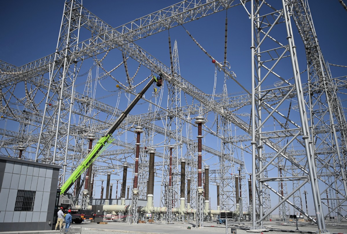 2025年9月28日,且末750千伏變電站新建工程建設(shè)現(xiàn)場,作業(yè)人員對管母金具進(jìn)行檢查復(fù)驗。(馬元 攝)