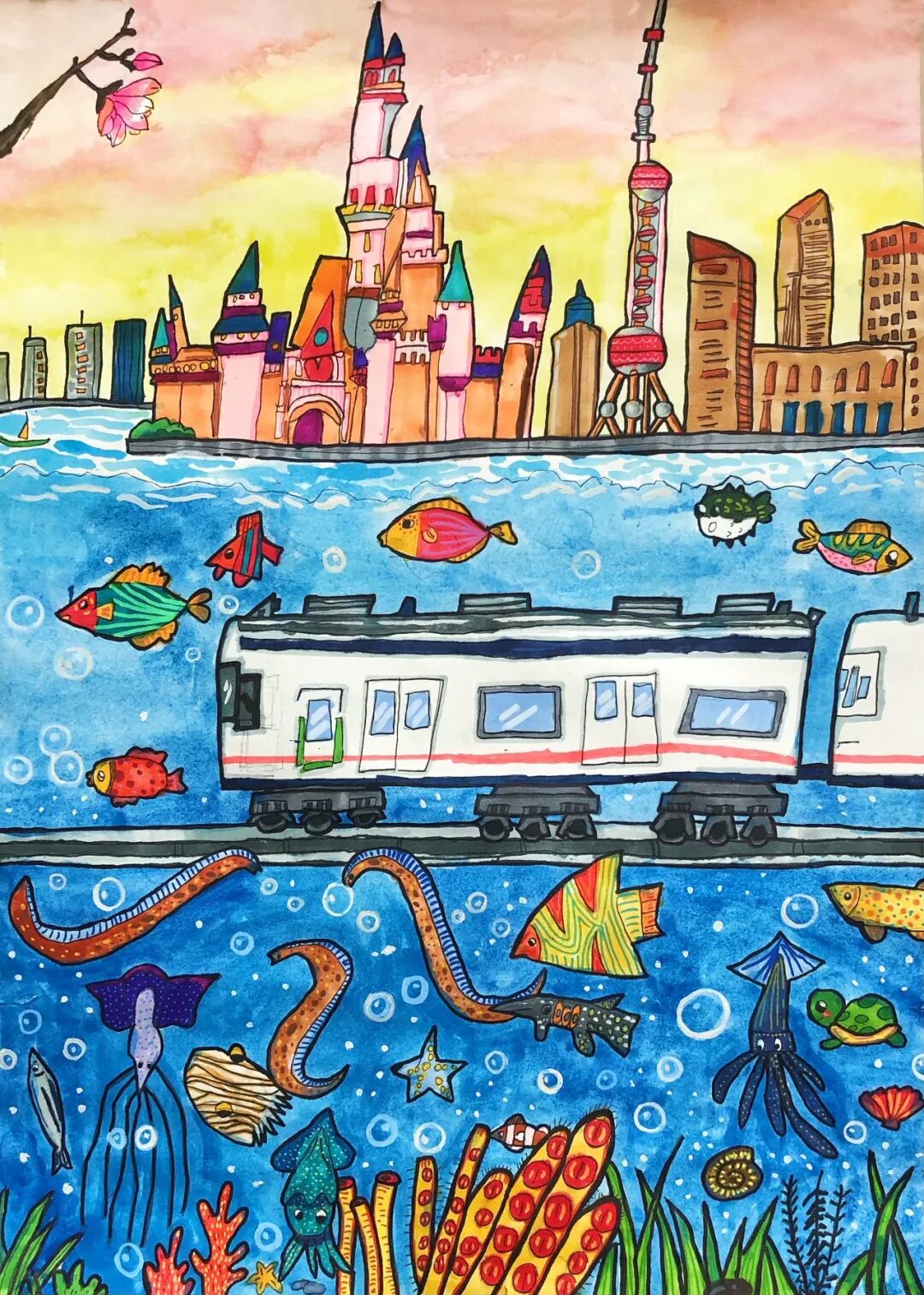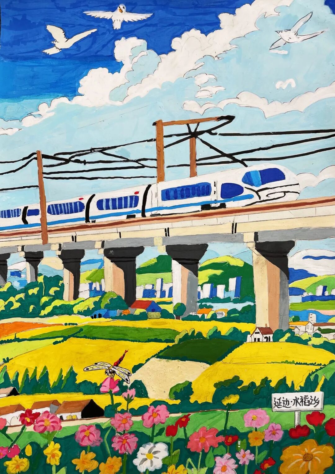 不遠(yuǎn)處徐鹽高鐵上,銀白色的高鐵像一道流星劃過(guò)水鄉(xiāng)。我的鉛筆在本子上沙沙作響,把窗外的景色畫(huà)下來(lái):成片的藕田里,粉白的荷花搖曳生姿;戴著斗笠的農(nóng)民在稻田里忙碌,身后的水渠泛著粼粼波光。列車(chē)員阿姨推著小推車(chē)走來(lái),“瓜子飲料礦泉水”的吆喝聲,和車(chē)輪與鋼軌的碰撞聲交織在一起,成為獨(dú)屬于旅途的音樂(lè)。