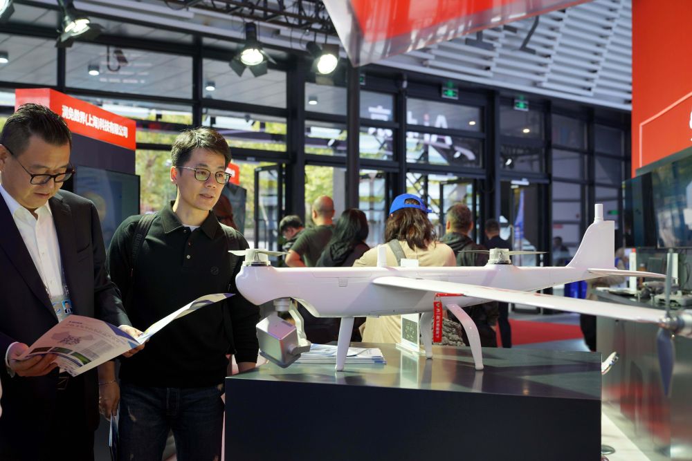 ↑ 11月6日,嘉賓在觀看可提供空中巡檢服務(wù)的“道通龍魚 Pro”垂直起降固定翼。新華社記者趙宇思攝