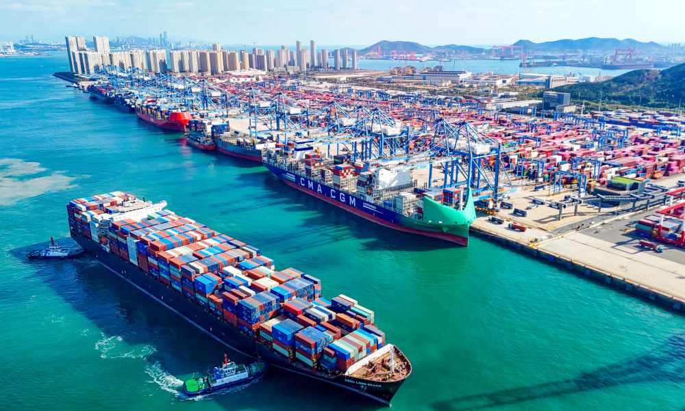 一艘貨輪滿(mǎn)載貨物駛出青島自貿(mào)片區(qū)(2025年11月5日攝,無(wú)人機(jī)照片)。新華社發(fā)(張進(jìn)剛攝)