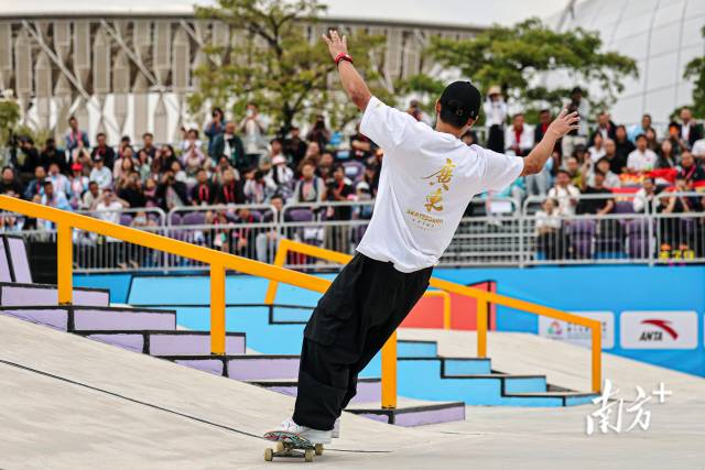 11月11日下午,十五運(yùn)會滑板項(xiàng)目男子街式?jīng)Q賽,廣東隊(duì)潘家杰完成高難度動作后展開雙臂與歡呼的觀眾們互動。鄭新洽 攝