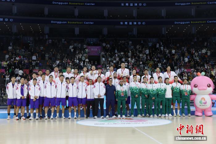 11月12日晚,第十五屆全國運(yùn)動(dòng)會(huì)籃球項(xiàng)目男子成年組金牌賽在東莞籃球中心舉行,廣東隊(duì)101比65戰(zhàn)勝浙江隊(duì)奪得金牌。圖為頒獎(jiǎng)儀式后,廣東隊(duì)、香港隊(duì)、澳門隊(duì)合影。中新社記者 盛佳鵬 攝