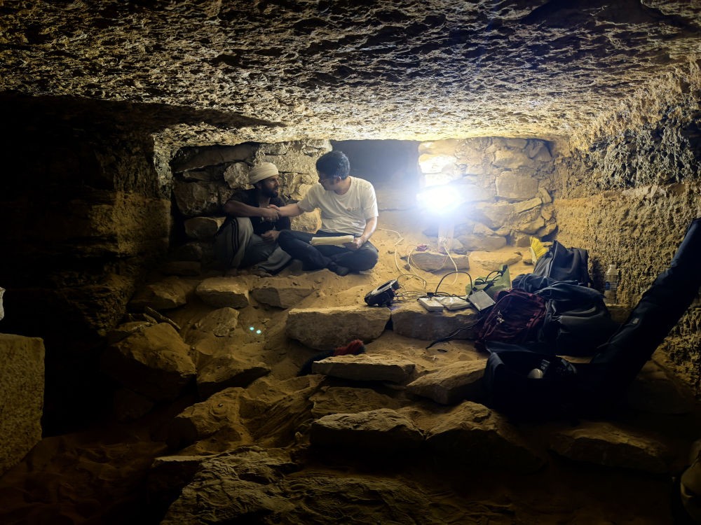 9月16日,在埃及開羅以南的薩卡拉考古遺址區(qū),中埃薩卡拉聯(lián)合考古項目中方領(lǐng)隊薛江(右)和埃方同行在一座貴族墓內(nèi)工作。(受訪者供圖)