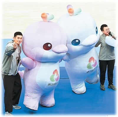 第十五屆全國運(yùn)動會吉祥物與觀眾互動。