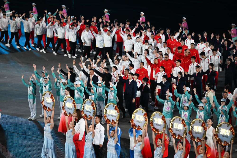 漫天星輝閃耀時,萬千豪情競風(fēng)流。馬龍、潘展樂、蘇炳添、王霜……熟悉的面孔接連出現(xiàn),來自五湖四海的運動員、教練員和裁判員一同入場。