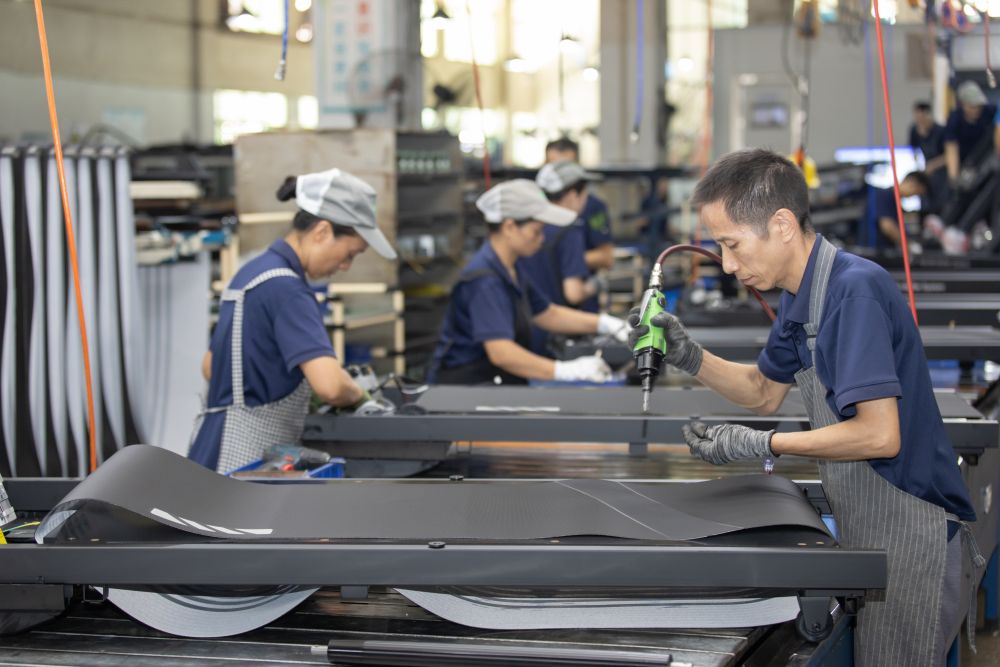 2025年9月12日,福建晉江一家體育器材工廠的工人在車(chē)間流水線(xiàn)上組裝跑步機(jī)。新華社發(fā)(連靜毅 攝)