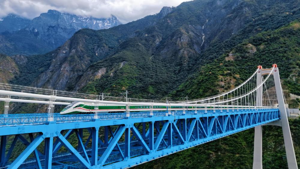 11月21日,動(dòng)車組列車通過(guò)虎跳峽金沙江鐵路大橋(無(wú)人機(jī)照片)。