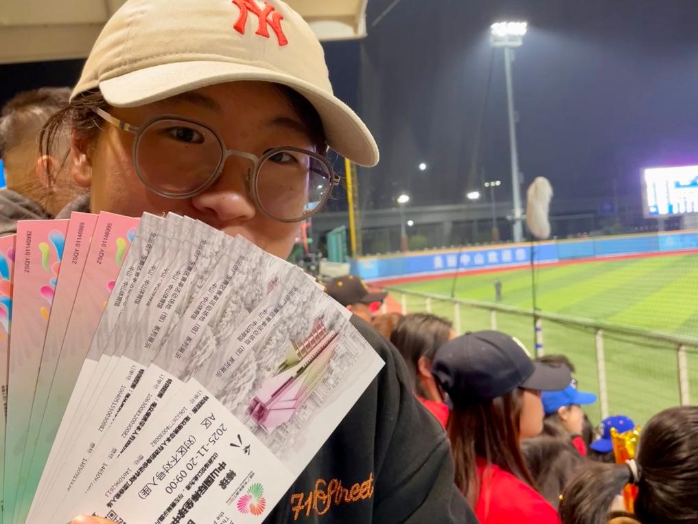 11月20日,一名觀眾在全運會棒球比賽現(xiàn)場展示自己的票根。新華社記者霍思穎 攝