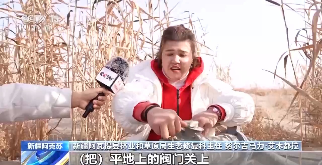 新疆阿瓦提縣林業(yè)和草原局生態(tài)修復科主任 努爾吉馬力·艾木都拉:把平地上的閥門關上,然后把全部壓力給到高處沙包上的滴灌管道。再生水來了,水源充足以后,現(xiàn)在成活率達到75%以上了。