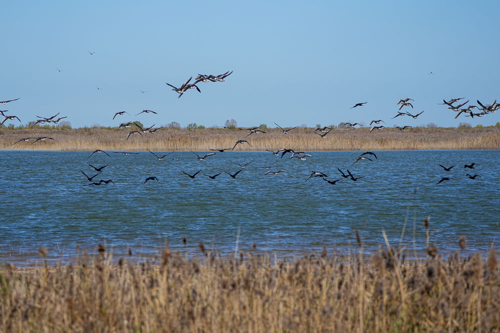 2025年11月13日,越冬候鳥在山東黃河三角洲國家級自然保護區(qū)飛翔。新華社記者 朱崢 攝