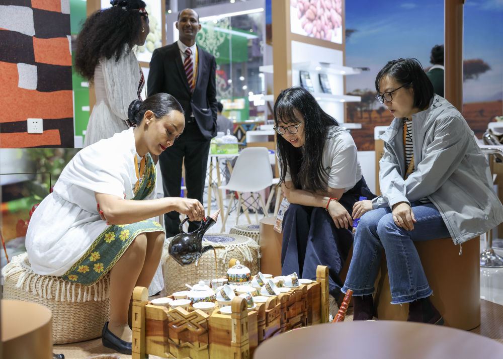 2025年11月7日,人們在第八屆進博會國家展埃塞俄比亞館品嘗咖啡。新華社記者 孟晨光 攝