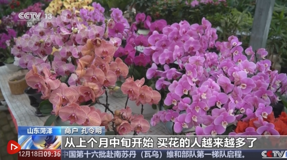 央視網(wǎng)消息:元旦臨近,各地花卉市場迎來銷售高峰。在山東菏澤市,蝴蝶蘭和杜鵑等年宵花卉集中上市,商家們正抓緊備貨,供應(yīng)節(jié)日市場。