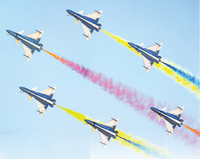 第十一屆空軍航空開放活動(dòng)和長(zhǎng)春航空展上,空軍八一飛行表演隊(duì)進(jìn)行飛行表演。鄒新江攝