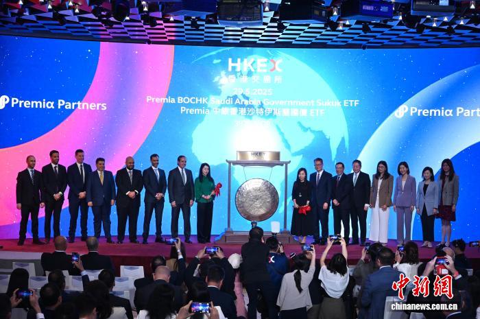 2025年5月29日,香港交易及結算所有限公司與沙特阿拉伯證券交易所集團在香港合辦“香港——沙特資本市場論壇”?,F(xiàn)場亦舉行Premia中銀香港沙特伊斯蘭國債交易所買賣基金(ETF)在香港上市的敲鑼儀式。圖為香港特區(qū)政府財政司司長陳茂波(右七)等嘉賓出席敲鑼儀式?!≈行律缬浾?李志華 攝