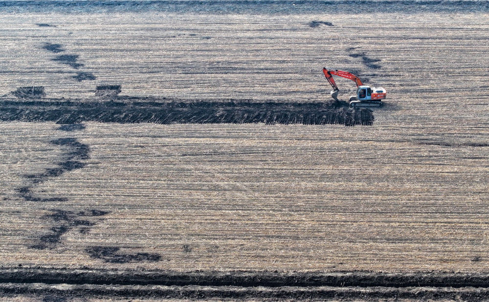 2025年3月11日,在天津市津南區(qū)八里臺鎮(zhèn)大韓莊村,工人駕駛挖掘機進行高標準農(nóng)田施工作業(yè)(無人機照片)。新華社記者趙子碩 攝