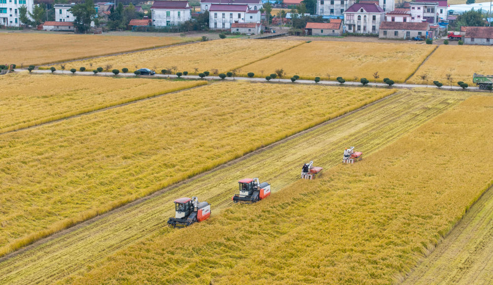 2025年10月30日,在江蘇省南通市通州區(qū)十總鎮(zhèn)育民村高標準農(nóng)田里,村民駕駛農(nóng)機收割水稻(無人機照片)。新華社發(fā)(翟慧勇攝)