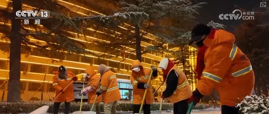 降雪后,當?shù)丨h(huán)衛(wèi)部門組織人員連夜上崗,清掃路面積雪。