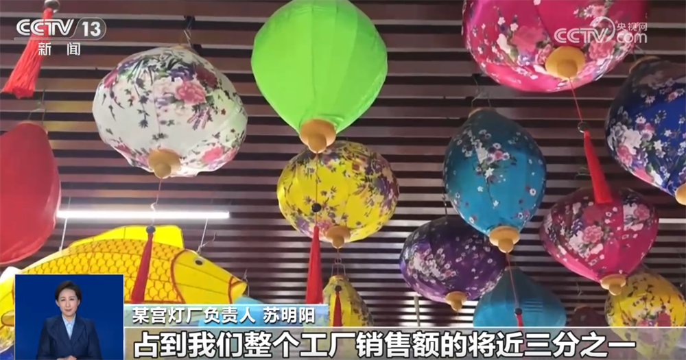 某宮燈廠負責人 蘇明陽:現(xiàn)在一天直播4小時—5小時,到年底我們一天開播將近16個小時。在線上賣,占到我們整個工廠銷售額的將近三分之一。